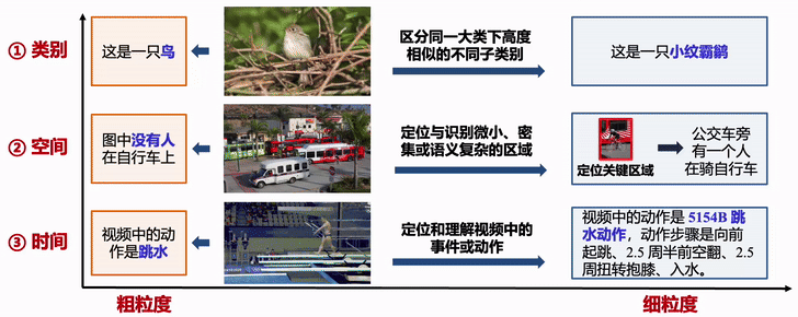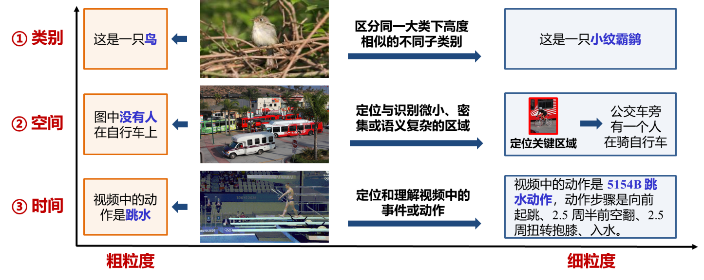 - 细粒度多模态大模型:提取并融合文本、图像、视频等多模态的数据表征,通过大语言模型进行推理,经过微调后适配到多种细粒度视觉感知任务。从人类视觉系统的“双流假设”出发,视觉感知可分解为“识别对象”、“确定位置”与“跟踪变化”三个基础阶段,分别对应细粒度多模态大模型的三个维度:(1)类别细粒度:区分同一大类下高度相似的不同子类别。例如,不仅识别出“鸟”,更能区分“小纹霸鹟”与“阿卡迪亚霸鹟”等具体鸟类物种。(2)空间细粒度:在高分辨率输入中对微小、密集或语义复杂的区域进行定位与识别。不仅检测显著物体,还能根据逻辑推理精准定位复杂场景中的特定目标或理解精细的局部细节。(3)时间细粒度:在视频中定位和理解事件或动作,不仅生成视频摘要,还能精确定位动作的时间边界,并将复杂动作分解为子动作进行时序分析。