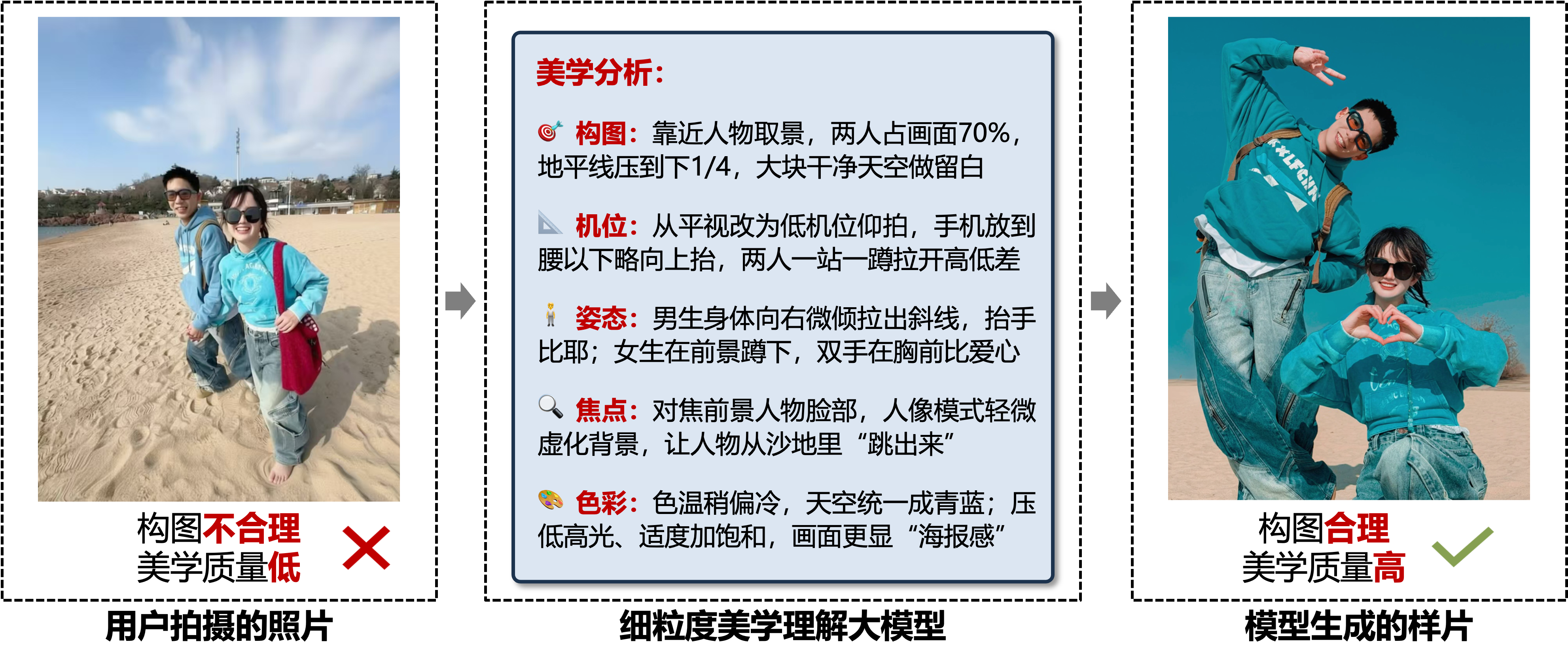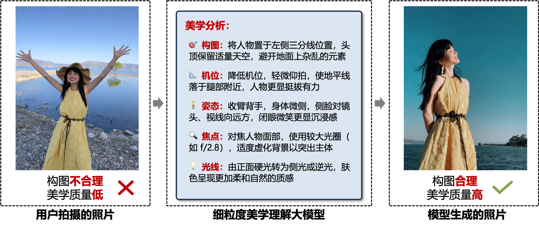 - 美学理解:模拟人类的审美感知与情感响应过程,研究面向图像与视频的美学质量评价、情感语义分析及审美导向的生成与增强技术,包括影像美学分析、智能拍摄引导、构图取景优化、可控照片精修等任务。例如,给定一张照片,模型可基于摄影美学规则自动诊断画面问题,智能推荐取景范围与拍摄机位,并进一步优化画面构图布局、光影关系与色彩层次,帮助非专业用户创作出媲美专业摄影师水准的作品。